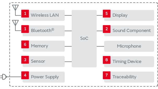 拡大が期待され注目されるAIスピーカー市場。携帯電話・スマートフォンを通じて技術を培ったムラタの製品は、AIスピーカー市場においても無線通信モジュール、センサ、コンデンサ等で小型・低背・低消費電力化に貢献します。