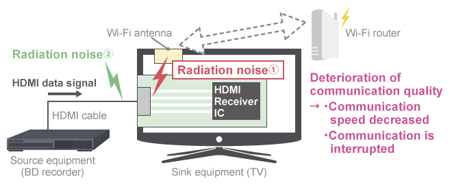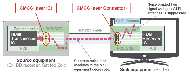 The sink-side CMCC can suppress the common mode noise generated from the HDMI signal wiring of the sink equipment by preventing common mode noise from entering the Wi-Fi antenna.