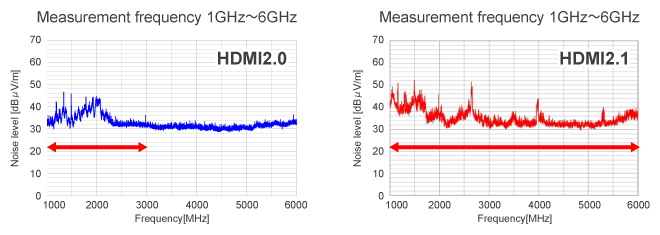 First, we verified how much HDMI communication affects Wi-Fi. We confirmed that, when HDMI 2.1 communication was started, the Wi-Fi reception sensitivity dropped by 6 to 10 dB in the 2.4 GHz and 5 GHz bands. When noise actually entering the Wi-Fi was confirmed, we found that it overlapped with the 2.4 GHz and 5 GHz bands.