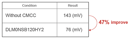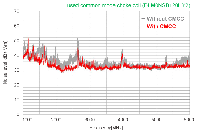 CMCCs are installed near the output pins of the IC at the HDMI source side and near the connectors at the sink side. The source-side CMCC installed near the IC can suppress the common mode noise generated from the transmission ICs at the source side by preventing the propagation of common mode noise at the sink side.