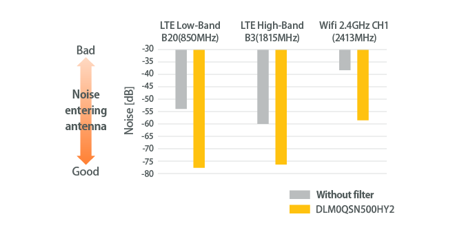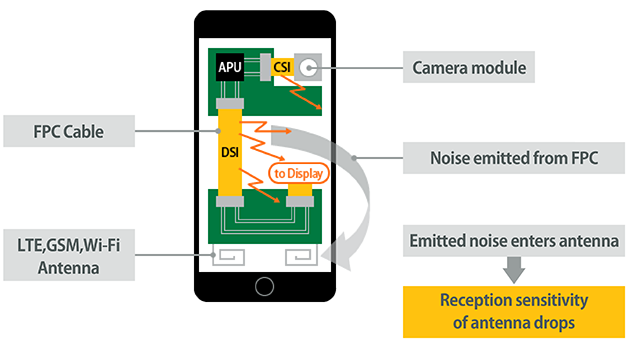 Noise is emitted from the FPC cable by digital signals that pass through MIPI D-PHY lines between the main board and module, and this noise can enter the antenna in the wireless circuit, which can result in reduced reception sensitivity of the antenna. For this reason, noise passing through MIPI D-PHY lines must be removed.