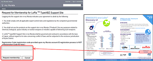 After creating a my Murata account, please use the “registration code” that comes with the evaluation board and enter it on the Type 1SJ LoRa support site to request access.