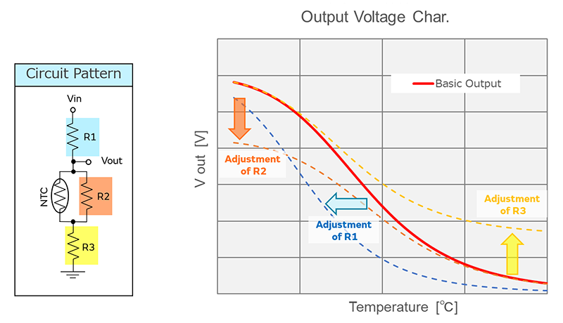It is possible to change the output voltage according to the circuit pattern of NTC thermistor. You can simulate at the following URL.