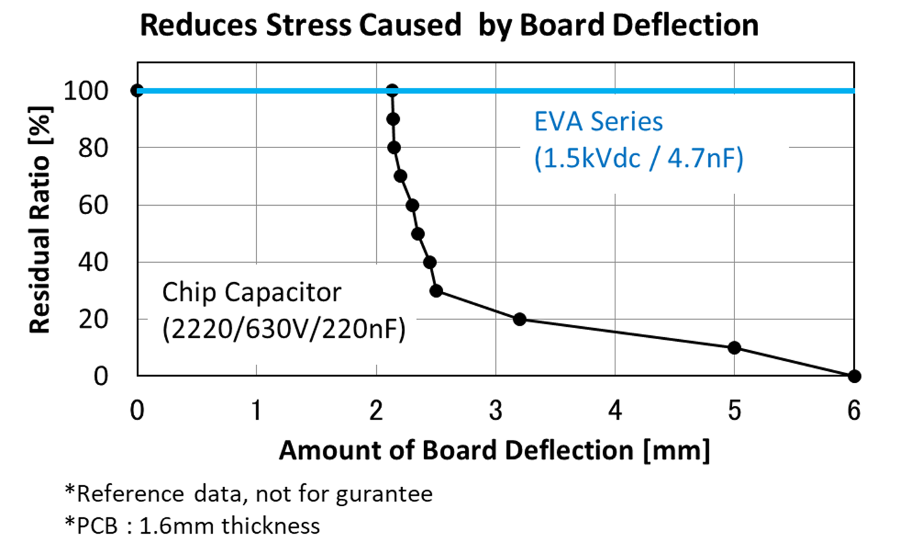 The EVA devices are the latest addition to Murata's range of safety capacitors, which also consists of DE6 components in a through-hole mounting package and KCA components that offer a creepage distance of 4mm. Despite being longer for increased creepage distance, EVA capacitors retain the KCA range's mechanical strength, thanks to the metal terminations and robust internal design. The end result is a product range that can withstand cracking induced by PCB flexure. In Figure 2, we can see the comparative reduction in strength between the EVA series and a chip capacitor. At just over 3mm deflection, the chip-based solution residual ratio has dropped to 20%.
