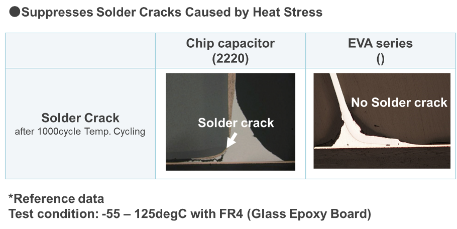 The EVA ranges' structure also creates an increased resistance to solder cracking between the device and the board, as they pass through thousands of thermal cycles. Figure 3 shows a comparison between the EVA series and a normal chip capacitor.