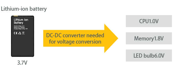 DC-DC converters are needed for power supply circuits only. The CPU, memory, LEDs, and other devices require many different DC voltages to run. However, in the lithium-ion batteries used in mobile devices, for example, the battery voltage (power supply) outputs about 3.7 V only. DC-DC converters are needed for adjusting these differences in voltages. DC-DC converters are required in most electronic devices, and typically, a large number of them are used in a device.