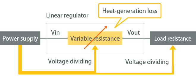 A linear regulator is the simplest conversion method, and the voltage is converted by voltage division using resistors. For example, to set half of an input voltage as the output voltage, an equal load resistance and regulator variable resistance are used to divide the input voltage by one-half.