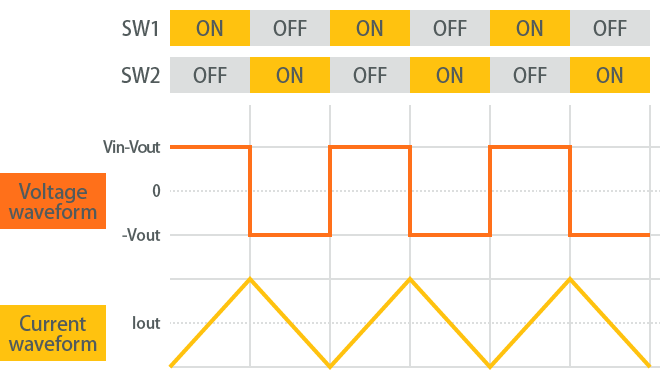 When SW1 turns ON and SW2 turns OFF, the voltage from the input power supply is supplied directly to the power inductor, and the electric potential of point A becomes equal to Vin. Next, when SW1 turns OFF and SW2 turns ON, the power inductor is isolated from the input power supply and is connected to the GND. As a result, the electric potential of point A becomes equal to GND.