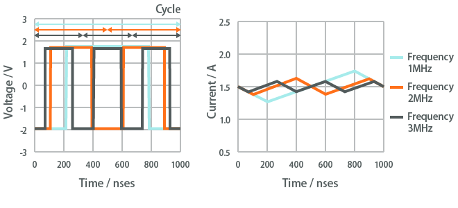 When the inductance and frequency fluctuate, the voltage size does not change, but this affects the size of the ripple current. When the inductance becomes large, the change in current is reduced, and so the ripple current becomes smaller (Figure 2-5-7). Also, when the frequency becomes large, this shortens the time for one cycle, and so the ripple current becomes smaller (Figure 2-5-8).