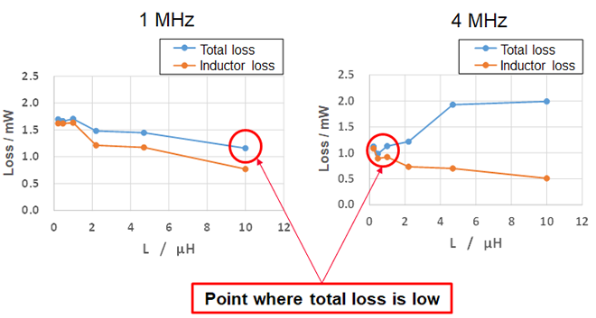 Based on these results, we determined that the appropriate inductance value for reducing total loss is around 10 µH at 1 MHz and 0.47 µH to 1.0 µH at 4 MHz.