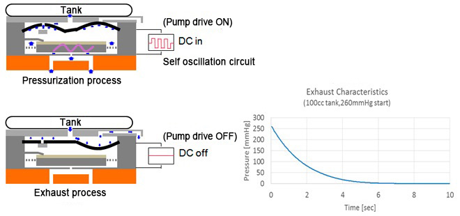 This device has a passive type valve function in addition to the pump function, and the discharge starts when drive is stopped during positive pressure. The air flow path differs during pressurization and discharge.