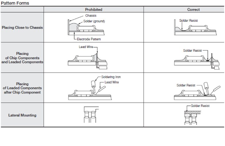 Excess solder fillet height can multiply these stresses and cause chip cracking. When designing substrates, take land patterns and dimensions into consideration to eliminate the possibility of excess solder fillet height.