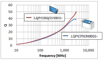 Comparison between a product in the new series (LQP02HQ3N9B02) with a previously available product (LQP03TN3N9B02)