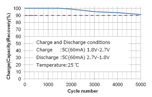 3. Long life: Charge (capacity) recovery rate of 90% or higher after 5,000 cycles (capacity reduction of 10% or less)