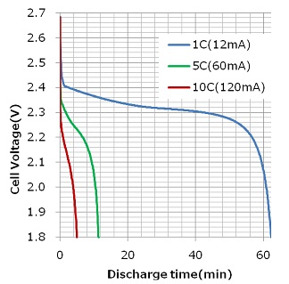 2. Capable of continuous discharge at a high rate of 10 C (120 mA)
