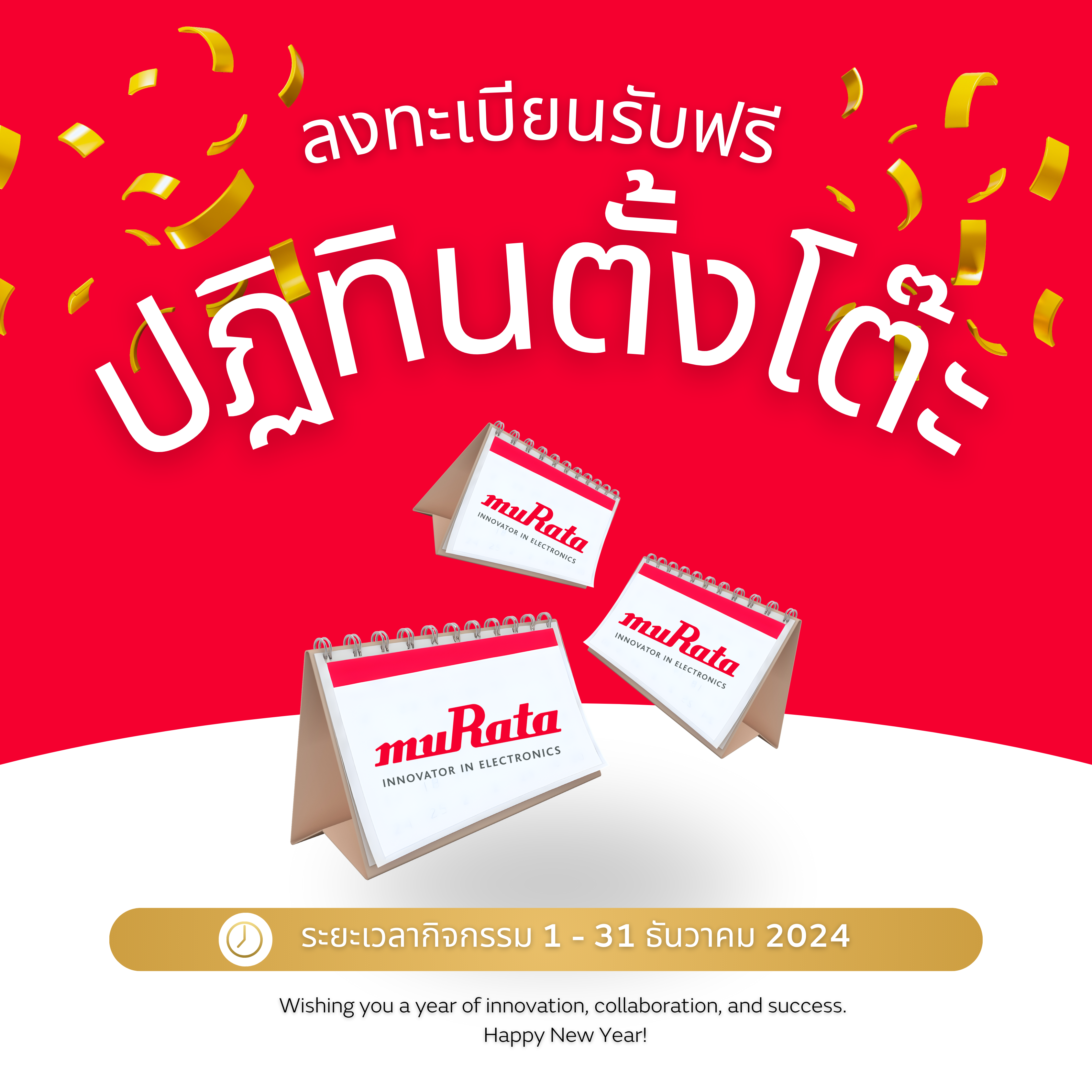 Murata ส่งความสุขรับปีใหม่นี้ ลุ้นรับฟรี!! ปฏิทินตั้งโต๊ะ ปี 2025 จำนวน 100 รางวัล อย่ารอช้า! ลงทะเบียนด้านล่างนี้ แล้วรอลุ้นเป็นผู้โชคดีได้เลย!