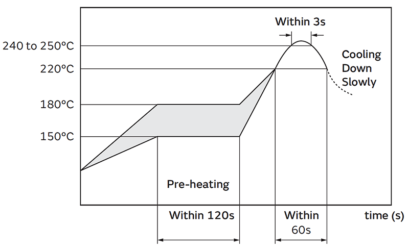 When products are immersed in solvent after mounting, pay special attention to maintain the temperature difference within 100°C. Soldering must be carried out by the above mentioned conditions to prevent products from damage. Set up the highest temperature of reflow within 260°C.