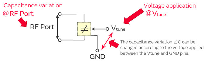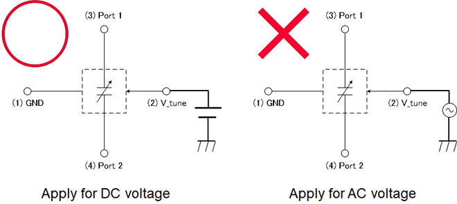 To change the capacitance, apply for DC voltage to V_tune terminal. It does not change even if AC voltage is applied.