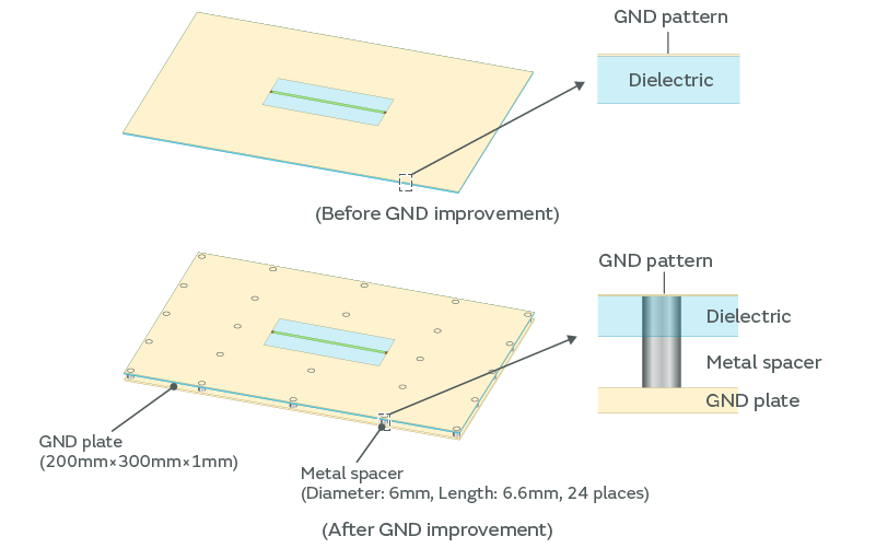 It is widely known that, in addition to the shape of the GND pattern, the connection between the board GND and the metal chassis can affect noise. The implementation of such changes to the GND for the purpose of reducing noise is called GND improvement. Here, we installed a metal plate (GND plate) under the board and connected it to the GND pattern of the board (Grounding). The simulation model is shown in Figure 2-6. Metal spacers (diameter 6mm, length 6.6mm) were used for the connection.