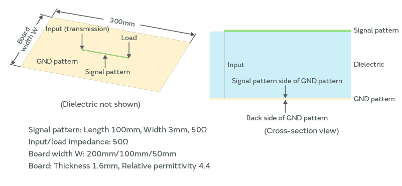 It is widely known that the noise can be changed simply by modifying the size or layout of the board, even when using the same circuit design. Therefore, we used three simulation models with board widths (GND widths) of 200mm, 100mm, and 50mm. The other conditions were the same, with the transmission line designed to have a characteristic impedance of 50Ω, and with the input signal at 1V and scanning at 30MHz to 1GHz.