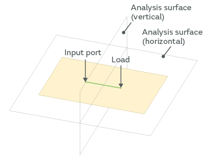Next, we simulated the magnetic field distribution. Figure 2-4 shows the analysis surfaces. The analysis surface (horizontal) was set at the dielectric side (bottom) of the signal pattern and GND pattern. This is because the magnetic field was stronger at the bottom than at the surface layer side (top) near the signal pattern. The analysis surface (vertical) was set at the center of the board. We set the analysis frequency to 1GHz, which had the strongest radiated emission.