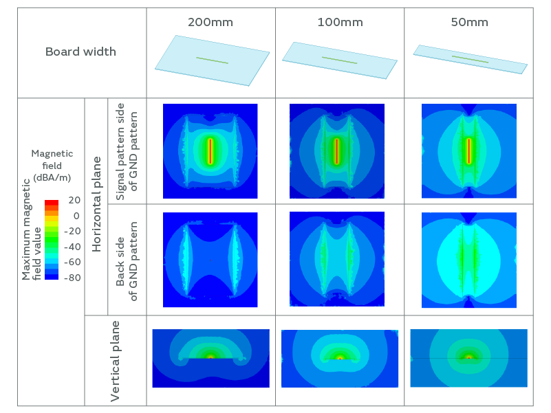 We can see that as the GND width is narrowed down, the magnetic field wraps more strongly around to the back surface of the board, resulting in a significant change in the magnetic field distribution. This indicates that it is advantageous to consolidate the circuits that have strong noise due to a high-speed signal at the center of a large board.