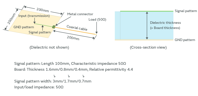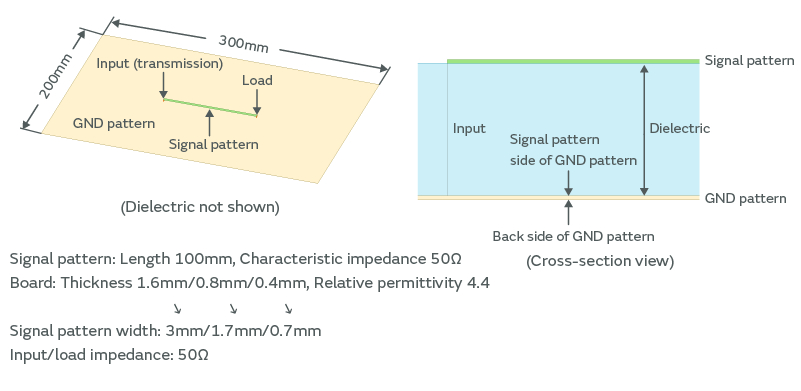 The simulation model is shown in Figure 2-16. We prepared three different models with board thicknesses of 1.6mm, 0.8mm, and 0.4mm. The signal pattern width was adjusted to provide a characteristic impedance of 50Ω. This ensures that the current value remains the same even when the board thickness is changed.