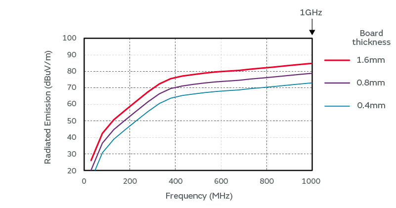 As described earlier, the noise reduction effect can be achieved by making the board thinner and decreasing the distance between the signal pattern and GND pattern. However, because thinner boards tend to bend more easily and increase the risk of failure, it is necessary to use multilayer boards to ensure the appropriate thickness.