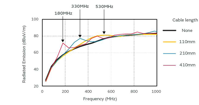 Figure 3-2 shows the results of the radiated emission simulation. As you can see, the radiated emission increases when a cable is connected. It is also clear that the resonance frequency shifts to a lower frequency as the cable length increases. This shows that the cable affects the noise radiation.