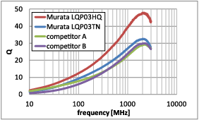 The frequency characteristics of the Q are shown in the graph by structure (wire wound, multilayer) of Murata's high frequency coil 1005 size. As shown in Figure 1, the feature of the wire wound type is the very high Q factor compared with the multilayer type.