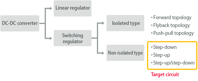 This section will describe the operation mechanism for non-isolated switching regulators. The structures of DC-DC converters are step-down, step-up, and step-up/step-down types. This section will describe the operation mechanism using a step-down switching regulator as an example.