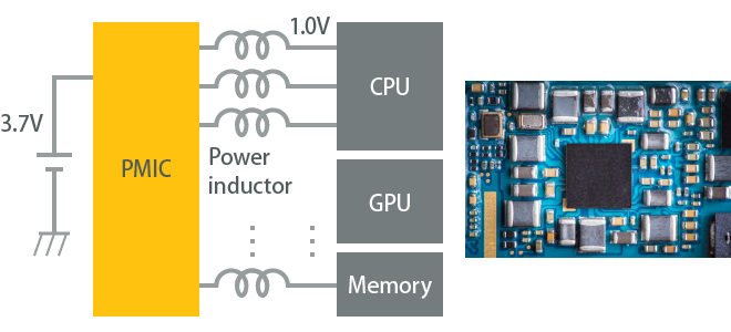 Digital circuits primarily refer to CPU, GPU, memory, and similar circuits. Digital circuits are characterized by a driving voltage of about 0.8 V to 1.8 V, which is lower than the battery voltage of 3.6 V to 3.8 V. For this reason, step-down DC-DC converters are needed. The DC-DC converters used for digital circuits are characterized by a high-speed switching frequency and large output current. The power inductors that are used here are compact and have a low L inductance value (L=about 1 uH).