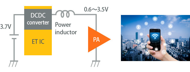 Following digital circuits, DC-DC converters are next most commonly used in RF circuits. The RF circuits that incorporate DC-DC converters are primarily envelope tracking ICs (ET ICs), baseband processors, Bluetooth modules, Wifi modules, and similar. Because these components run on a lower voltage than the battery, step-down DC-DC converters are needed. The DC-DC converters used for RF circuits are characterized by modular designs where power inductors and capacitors are already installed inside (L=about 2.2 uH).