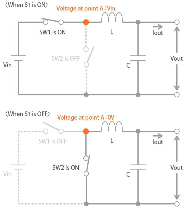 When SW1 turns ON and SW2 turns OFF, the voltage from the input power supply is supplied directly to the power inductor, and the electric potential of point A becomes equal to Vin. Next, when SW1 turns OFF and SW2 turns ON, the power inductor is isolated from the input power supply and is connected to the GND. As a result, the electric potential of point A becomes equal to GND.