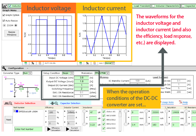 One of the web tools provided by Murata is the Murata DC-DC Converter Design Support Tool. This tool can be used to select the power inductors and laminated ceramic capacitors suitable for the operating conditions of the DC-DC converter. We can use this tool to see how the parameters affect DC-DC converter operation.