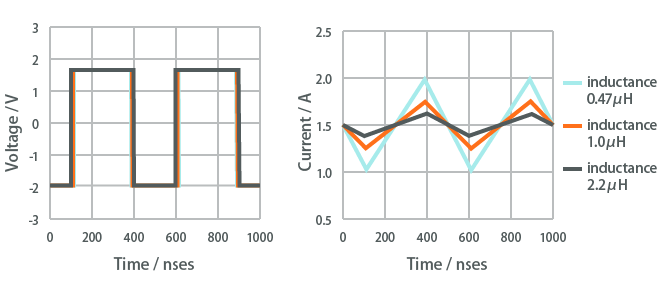 When the inductance and frequency fluctuate, the voltage size does not change, but this affects the size of the ripple current. When the inductance becomes large, the change in current is reduced, and so the ripple current becomes smaller (Figure 2-5-7). Also, when the frequency becomes large, this shortens the time for one cycle, and so the ripple current becomes smaller (Figure 2-5-8).