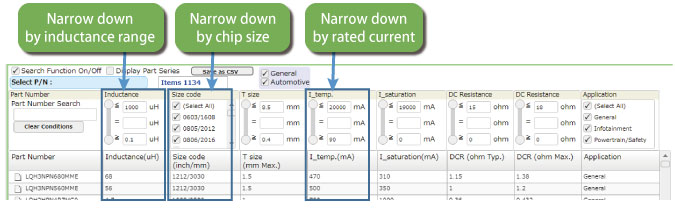 Inductors can be narrowed down by setting conditions for specs as follows.