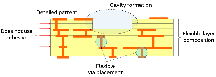 In addition to reducing the thickness variation by not using adhesive between the layers, the formation of minute electrode patterns enables highly precise impedance control, which is important in the high frequency range and in high-speed digital transmission.