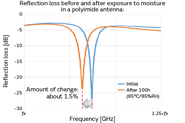 These graphs show the change in the resonance frequency before and after the high-temperature and high-humidity test conducted on both an antenna made with a Multi-layer LCP product and a conventional antenna made with FPC. We can confirm from the results that the characteristics of Multi-layer LCP product are much more stable than conventional FPC products. Such characteristics are one of the important parameters for products with mechanisms that resonate like antennas.