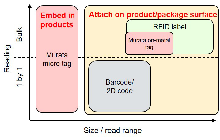 Murata has lineup of RFID tag covering various use case and products, including small embeddable tag. Generally it is difficult to read RFID tag on metal object. However, Murata also offers the RFID tag which is suitable for on-metal application.