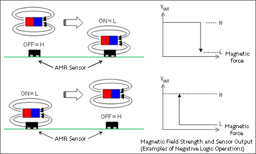 The sensitivity of the AMR sensor is the strength of the magnetic force that turns on (or off) the AMR sensor. The ON sensitivity (Hon) is the magnetic force that turns on the AMR sensor which was off with no or weak magnetic field, and the OFF sensitivity (Hoff) is the magnetic force that turns off the AMR sensor which was on with a strong magnetic field. The sensitivity of the AMR sensor varies by AMR sensor, and the Hon and Hoff in the datasheet indicate the specific range for that product.