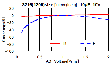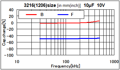 The graphs below show the various characteristics that affect the measured value of the capacitance, using as examples 3216 mm size, 10uF capacitors with B characteristics and F characteristics, respectively.