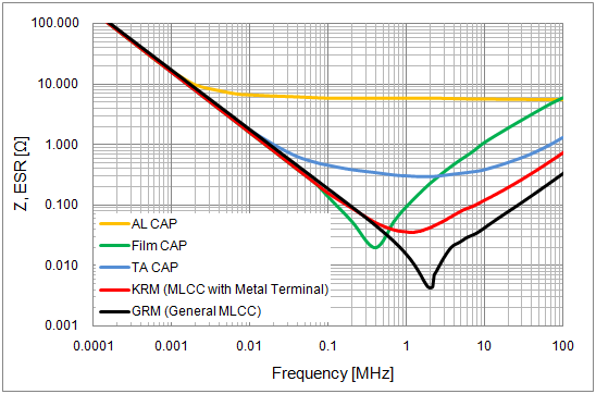 In the region of approximately 1 MHz or higher, the impedance of a capacitor that has metal terminals is higher than that of an MLCC. However, its impedance is lower than that of an aluminum electrolytic capacitor, a tantalum capacitor or a film capacitor.