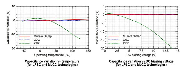 Since a silicon capacitor uses a paraelectric material, the changes in capacitance with respect to DC bias and temperature are extremely low.