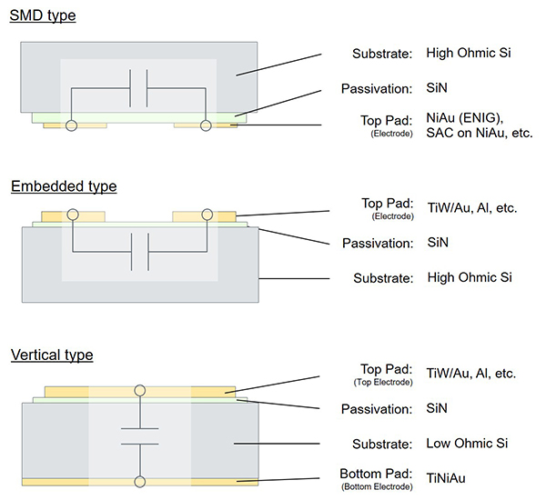 Related terms : Silicon Capacitor(Si-Cap), Silicon IPD(Si-IPD, Integrated Passive Device), Pad, electrode, mounting, surface mount(SMD), embedded, vertical electrode, vertical