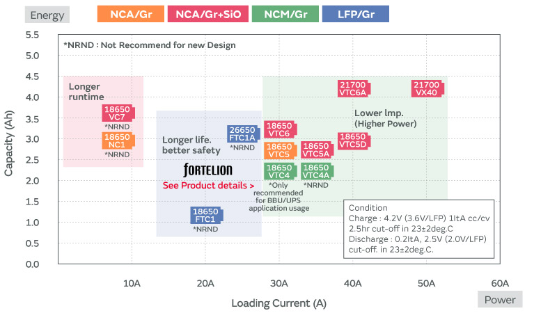 US18650VTC5APDF 2,600 NCA Gr, SiO 3.6 47.1 φ18 65 35 power