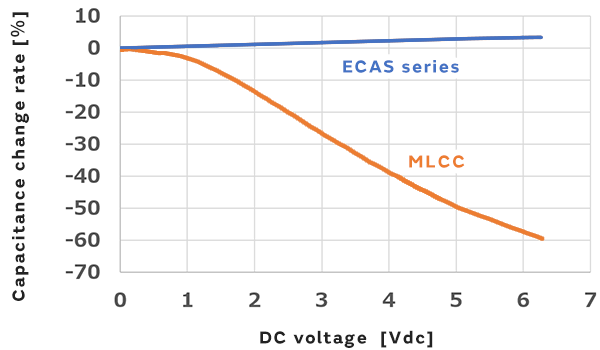 By contrast, the main components of the ECAS series are metal and resin, which provide extremely high mechanical strength compared to MLCC.