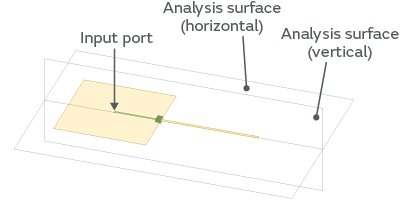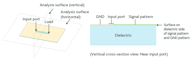 Next, we simulated the magnetic field distribution. Figure 2-4 shows the analysis surfaces. The analysis surface (horizontal) was set at the dielectric side (bottom) of the signal pattern and GND pattern. This is because the magnetic field was stronger at the bottom than at the surface layer side (top) near the signal pattern. The analysis surface (vertical) was set at the center of the board. We set the analysis frequency to 1GHz, which had the strongest radiated emission.