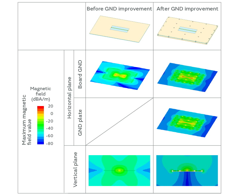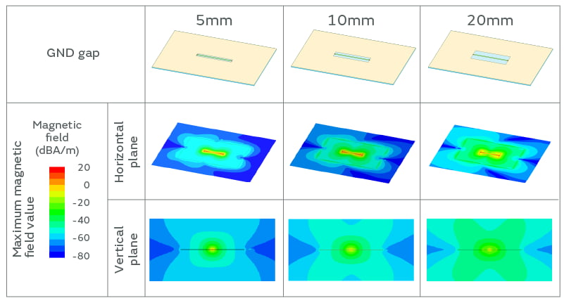 We can see that as the GND width is narrowed down, the magnetic field wraps more strongly around to the back surface of the board, resulting in a significant change in the magnetic field distribution. This indicates that it is advantageous to consolidate the circuits that have strong noise due to a high-speed signal at the center of a large board.