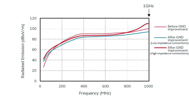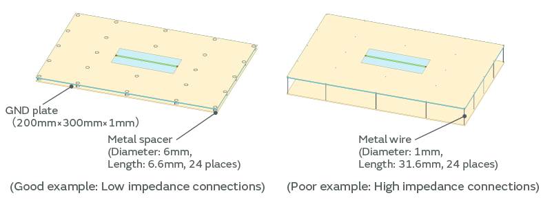 It is difficult to obtain the noise reduction effect by GND improvement if the board GND and GND plate are connected at a high impedance. Therefore, it is important to connect at a low impedance.